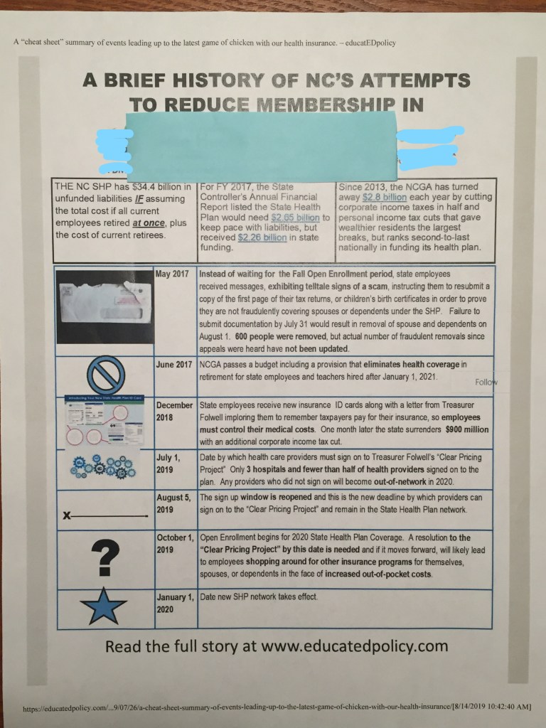 This confrontation rekindled other concerns I had with actions taken by the NC General Assembly and Treasurer Folwell since he took office in January 2017. To me, this was just the latest action in a series of attempts to reduce membership in the State Health Plan. I chose to turn my mental notes into public ones.