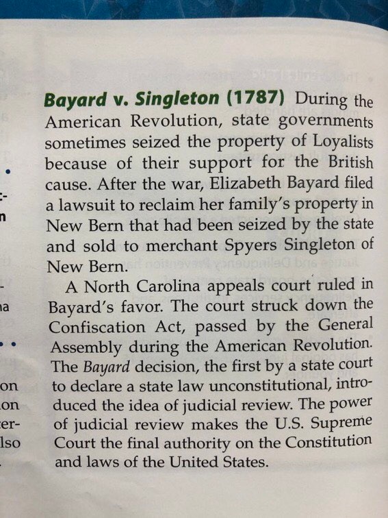 For those in need of a refresher, judicial review is a key check-and-balance between branches of government that empowers the judicial branch to evaluate whether or not actions taken by the executive or legislative branches follow the Constitution. Here’s a segment from a civics book in my NC classroom: