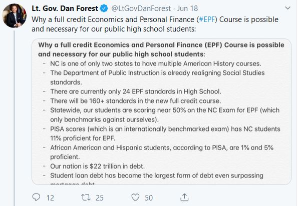 ACTION NEEDED BY NOON TODAY: On June 4th a delegation of social studies teachers (myself included) met with a representative of Lt. Gov. Dan Forest’s office (all roads on this issue lead to him) to explain why the reorganizing of the high school social studies curriculum to include a semester course on personal finance was unnecessary and disruptive. We offered a compromise that would double instruction in personal finance but not reorganize the four courses we teach.