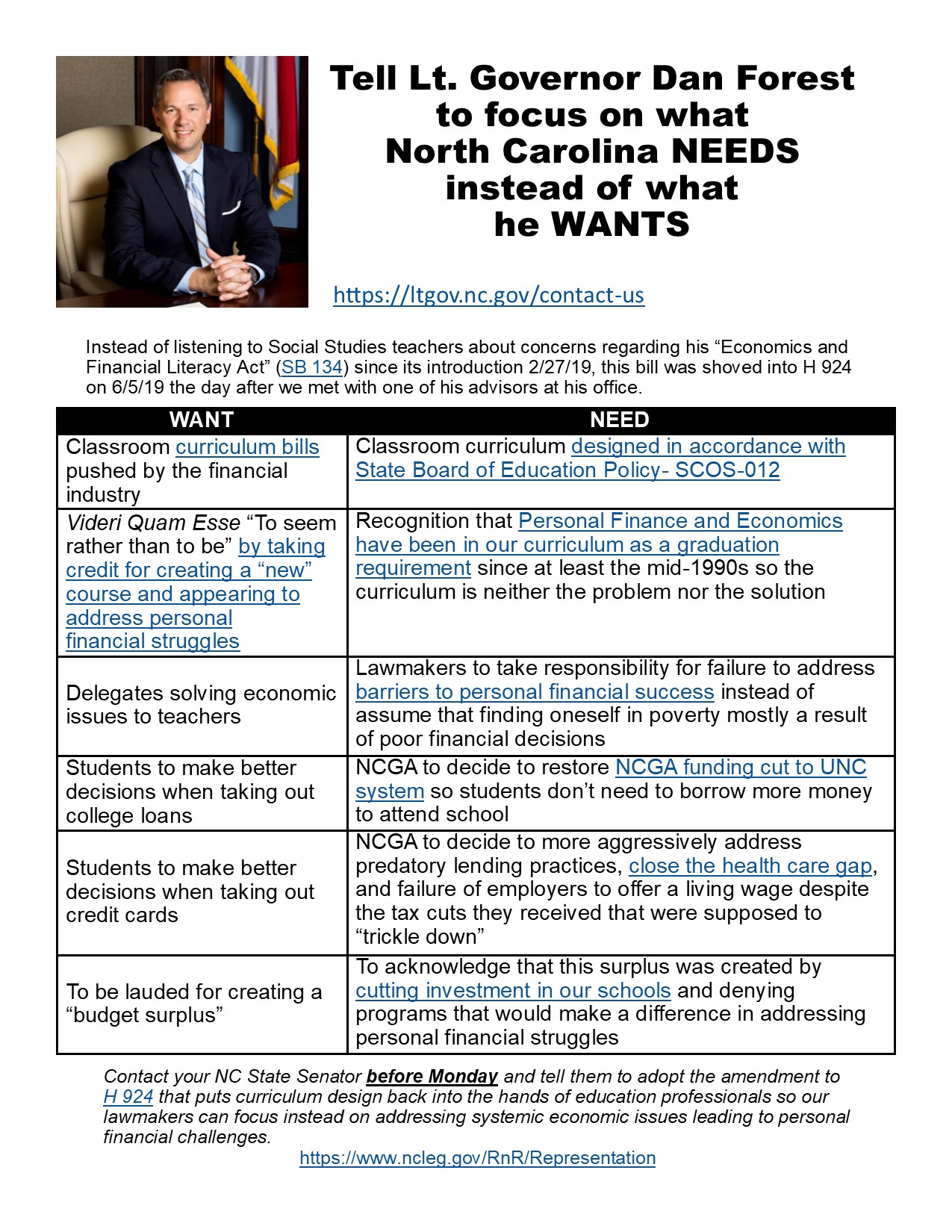 Students learn personal finance in a course required for graduation. Districts have started offering teacher contracts. We do not need H 924! Dan Forest needs it as he runs for Governor with a “bipartisan” talking point to show he cares about public education (he doesn’t) and people in poverty (he doesn’t). Contact your House representatives and tell them we don’t need or want this bill! Thank you Sam Searcy for standing strong with teachers.