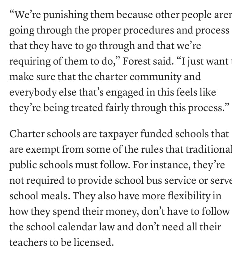To be clear, I think basic mandates such as transportation, food and teacher licensure are fundamental and should be required of all schools receiving public money. Our state writes blank checks after charters are formed, yet continually adds bureaucratic hoops for public schools on the premise that local schools won’t use the money in the best interest of students. State policy is invading our classrooms with non-educators micromanaging curriculum, assessment and staffing.