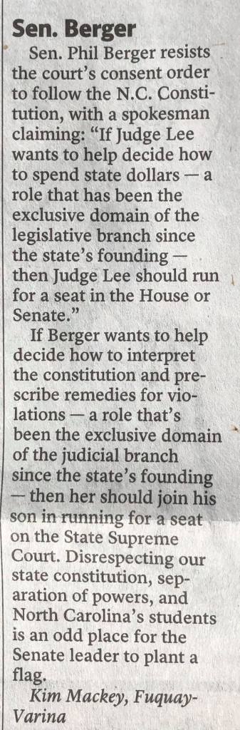 Raleigh News & Observer: Letter to the Editor – Comment on Berger’s behalf showed disrespect for NC Constitution, separation of powers
